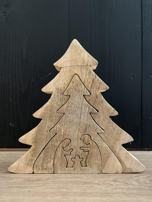 Kerststal boom puzzel naturel/wit hout, 23x4x23 cm