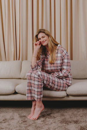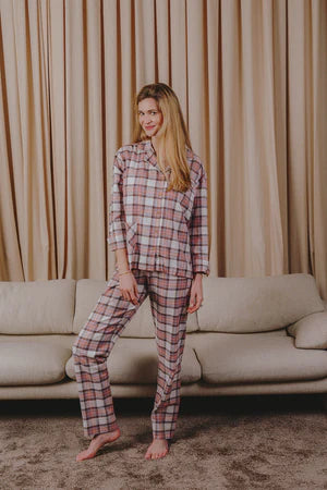 Mooie damespyjama lange mouw in carreaux multicolor