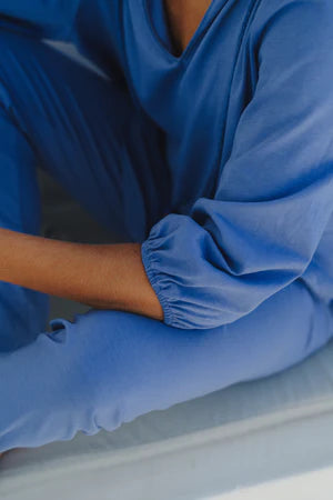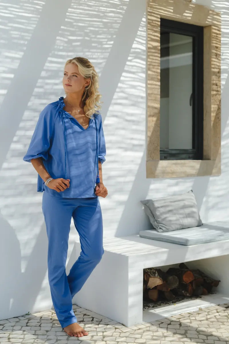 Mooie damespyjama lange broek & 3/4 mouw in kobalt blauw.