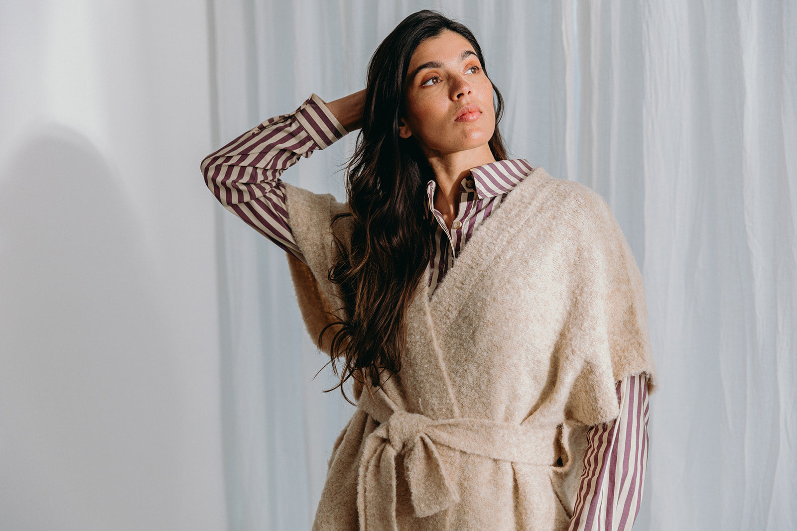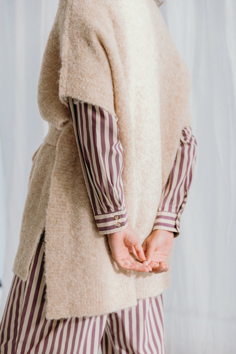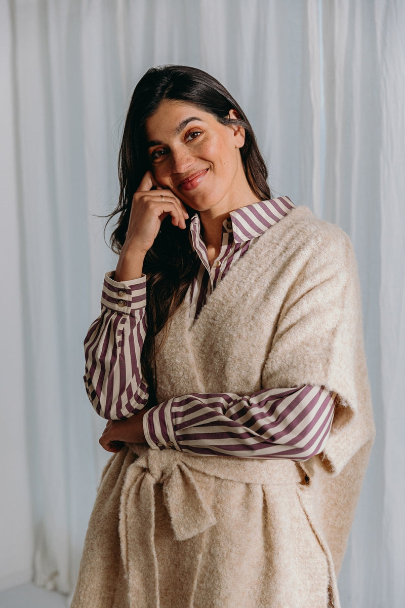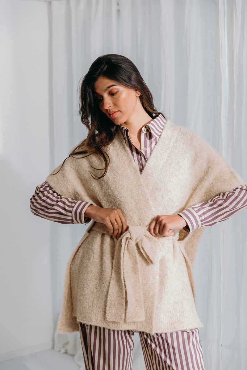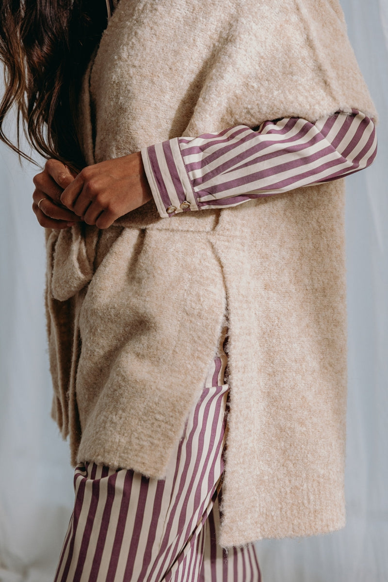 De Dré wikkeljas herdefinieert gezellige elegantie met een moderne twist.Gemaakt van een verfijnd bouclé breisel gemaakt van een doordachte mix, combineert dit stuk textuur, warmte en verfijning. Ontworpen met een veelzijdige riem, kan het jasje op twee manieren worden gestyled: over het achterpaneel of langs de binnenkant gedragen voor een chique, op maat gemaakt silhouet. Dit doordachte detail verheft Dré verder dan een klassieke "peignoir", en biedt een eigentijds alternatief dat naadloos overgaat van homewear gelaagdheid naar een verfijnd vest dat je buiten kunt dragen. De zachte latte tint benadrukt de bouclé textuur, waardoor het zowel tijdloos als veelzijdig is.