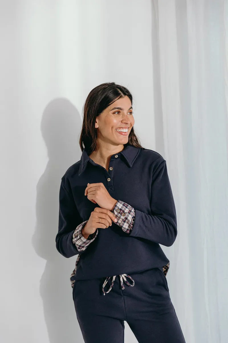 Introductie van de Jana winter homewear set, een perfecte combinatie van comfort, stijl en duurzaamheid. Gemaakt van 100% biologisch katoen in een geborsteld sweatshirtkwaliteit, biedt het een ultrazachte aanraking tegen de huid terwijl het ademend en milieuvriendelijk blijft. De set is verhoogd met het iconische Khloe dubbelgecheckt patroon in pruimen/marineblauw, te zien op het achterpaneel, langs de mouwen en als het trekkoord op de broek, wat een verfijnd, stijlvol accent toevoegt. Ontworpen met een ontspannen silhouet, de lange mouwen, ronde halslijn en gezellige pasvorm maken het ideaal voor kille dagen thuis. Praktische details zijn onder meer zijzakken in de broek, waardoor een supergezellige en moeiteloos chique winterhuiskledingset ontstaat.
