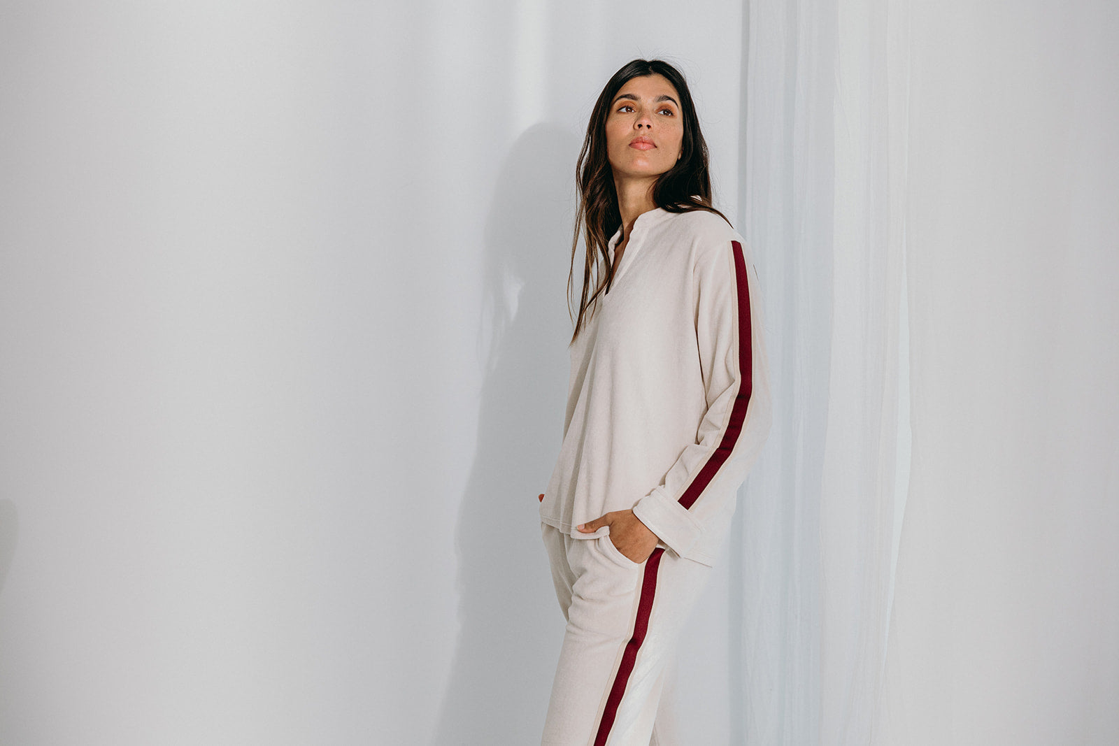 De Kate-collectie is moeiteloos stijlvol, met een sportief, modern silhouet dat is ontworpen om een opvallend stuk in je garderobe te worden. Deze veelzijdige stukken zijn gemaakt van zacht velours en combineren comfort met een flatterende, eigentijdse snit. De gekruiste V-halslijn en verfijnde manchetten voegen subtiele elegantie toe, terwijl de gebreide contrasterende randen langs de randen van de mouwen en zijkanten van de broek een gedurfde, trendy afwerking geven. Multifunctioneel ontwerp: kan worden gedragen als een warme pyjama of gezellige huiskleding. Verkrijgbaar in latte en pruim met latte/pruimen, of marine met latte/marine trims, Kate is een chique, sportieve keuze om in stijl te loungen.