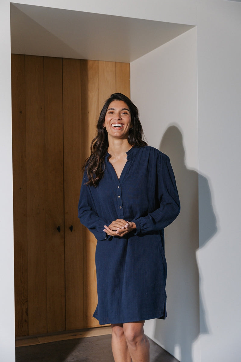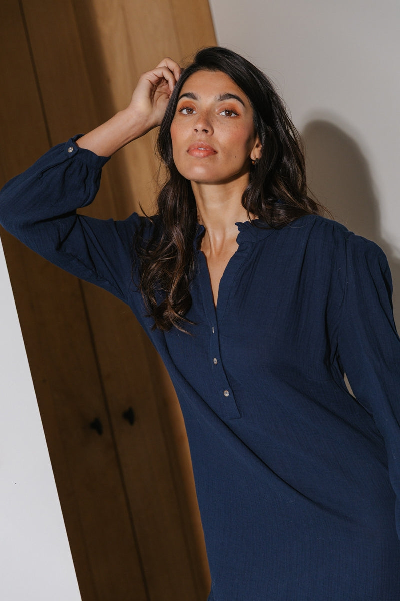 Als je op zoek bent naar een nachtjapje dat licht, luchtig en vrouwelijk aanvoelt, is Kiara de perfecte keuze. Gemaakt van 100% dubbelzijdig biologisch katoen (vaak "tetra" of "dubbel gaas" genoemd), is de stof uitzonderlijk zacht met een natuurlijk verfrommelde textuur die de ontspannen charme versterkt. Het ontwerp heeft een verfijnde V-hals met een vrouwelijke kraag afgewerkt met bourdon stiksels, aangevuld met een halve knoopsluiting met fijne knopen. Verkrijgbaar marine in een effen uni dubbel gaas - Kiara brengt ingetogen verfijning in je loungewear-collectie.