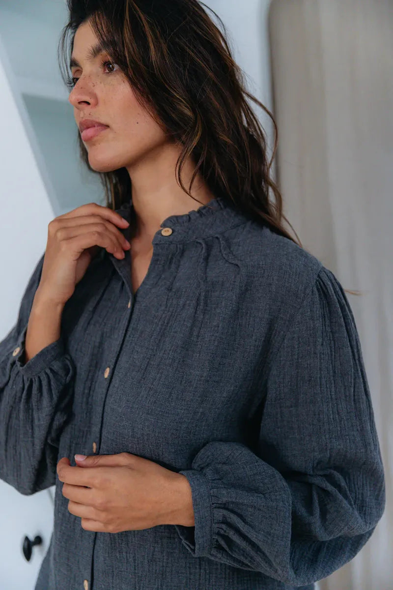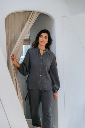 Als je op zoek bent naar een zeer zachte, dubbelzijdige, licht gekreukelde en 100% katoenen pyjama, dan is Ida jouw go-to collectie. Vrouwelijke kraag en geplak aan de voorkant met volledige knopen. Door het dubbelzijdige katoen (beter bekend als "tetra" of "dubbel gaas"), zal de stof meer getextureerd worden bij het wassen. We houden van deze verfrommelde look, maar als je liever hebt dat het weer in vorm wordt gebracht, kun je dat doen door te strijken of te stomen.