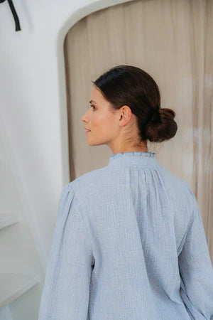 Als je op zoek bent naar een zeer zachte, dubbelzijdige, licht gekreukelde en 100% katoenen pyjama, dan is Ida jouw go-to collectie. Vrouwelijke kraag en geplak aan de voorkant met volledige knopen. Door het dubbelzijdige katoen (beter bekend als "tetra" of "dubbel gaas"), zal de stof meer getextureerd worden bij het wassen. We houden van deze verfrommelde look, maar als je liever hebt dat het weer in vorm wordt gebracht, kun je dat doen door te strijken of te stomen.