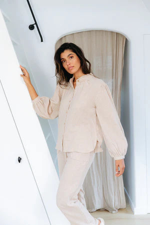 Als je op zoek bent naar een zeer zachte, dubbelzijdige, licht gekreukelde en 100% katoenen pyjama, dan is Ida jouw go-to collectie. Vrouwelijke kraag en geplak aan de voorkant met volledige knopen. Door het dubbelzijdige katoen (beter bekend als "tetra" of "dubbel gaas"), zal de stof meer getextureerd worden bij het wassen. We houden van deze verfrommelde look, maar als je liever hebt dat het weer in vorm wordt gebracht, kun je dat doen door te strijken of te stomen.