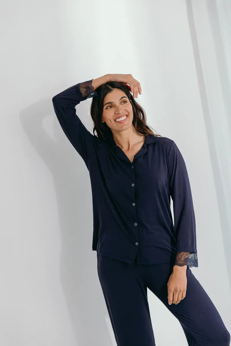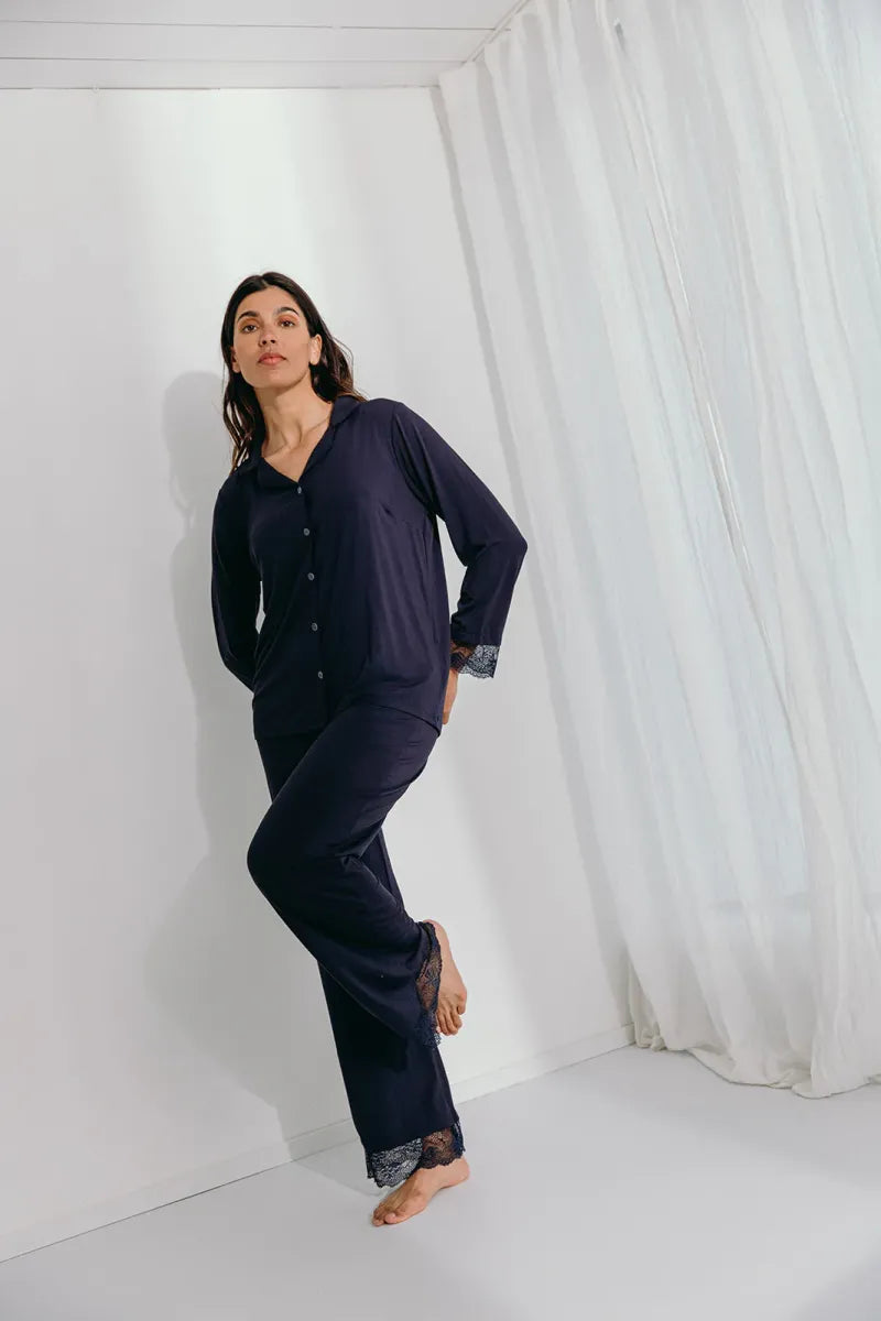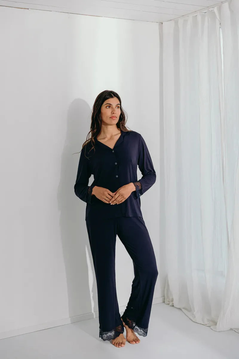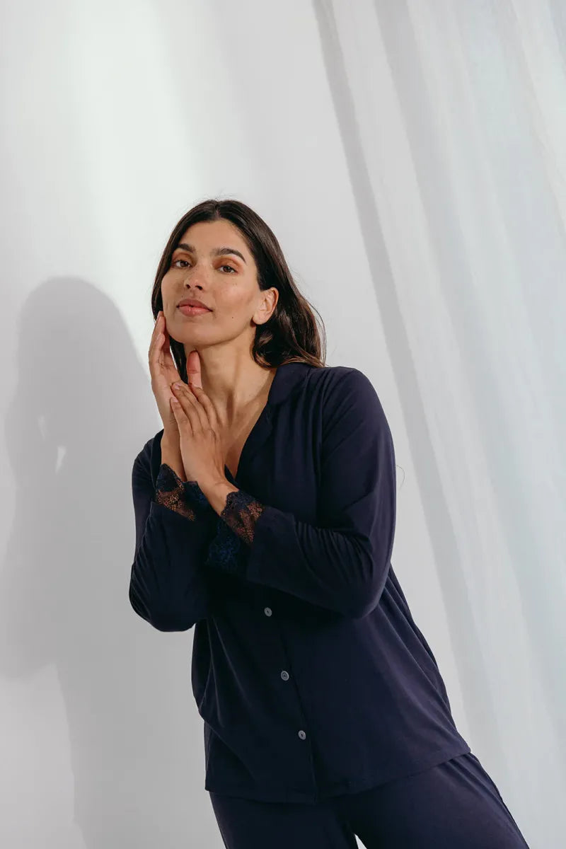 De Jasmine pyjama combineert elegantie en comfort voor een luxueuze en ontspannen slaapervaring. Gemaakt van zachte, ademende modal-mix stof, het voelt ongelooflijk zacht aan tegen de huid. Het klassieke button-down ontwerp is verbeterd met subtiele rivershell-knopen in toon-on-tone detail, terwijl het zorgvuldig geplaatste Italiaanse kant nu elegant is verwerkt achter de manchetten en aan de zoom van de broek, wat een verfijnde, ingetogen touch toevoegt. Een subtiele bustedart zorgt voor een flatterende pasvorm en het ontspannen silhouet biedt ultieme bewegingsvrijheid. Verkrijgbaar in de kleuren marine en pruim, de Jasmine wordt geleverd als pyjama of nachtjapon - perfect voor rustgevende nachten of gezellige avonden thuis.