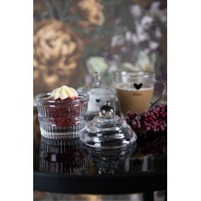 Mooi transparant landelijk glazen potje , bonbonnière met een deksel in de vorm van een cupcake erop.