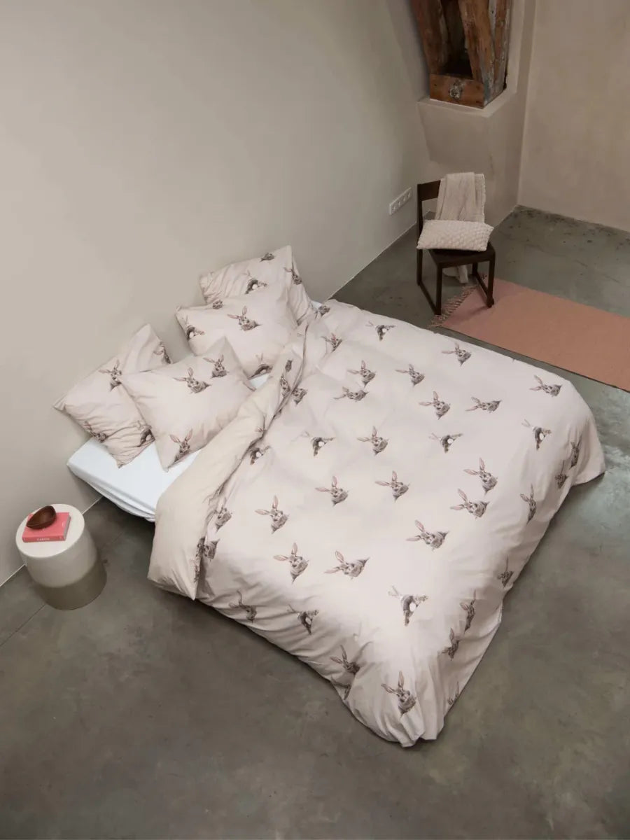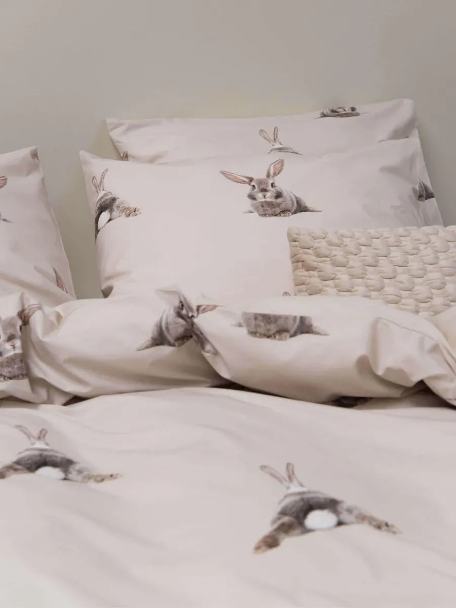 Dekbedovertrek met konijntjes print op zandkleurige achtergrond, met een klein beige stippenpatroon aan de onderkant.