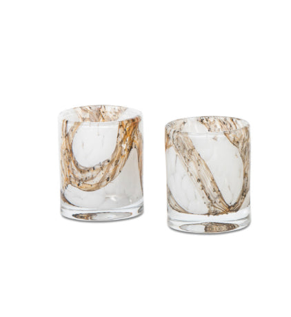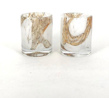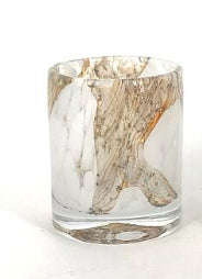 materiaal: glas met witte vlekken en lava afwerking, hoogte is 9 cm en diameter is 8 cm