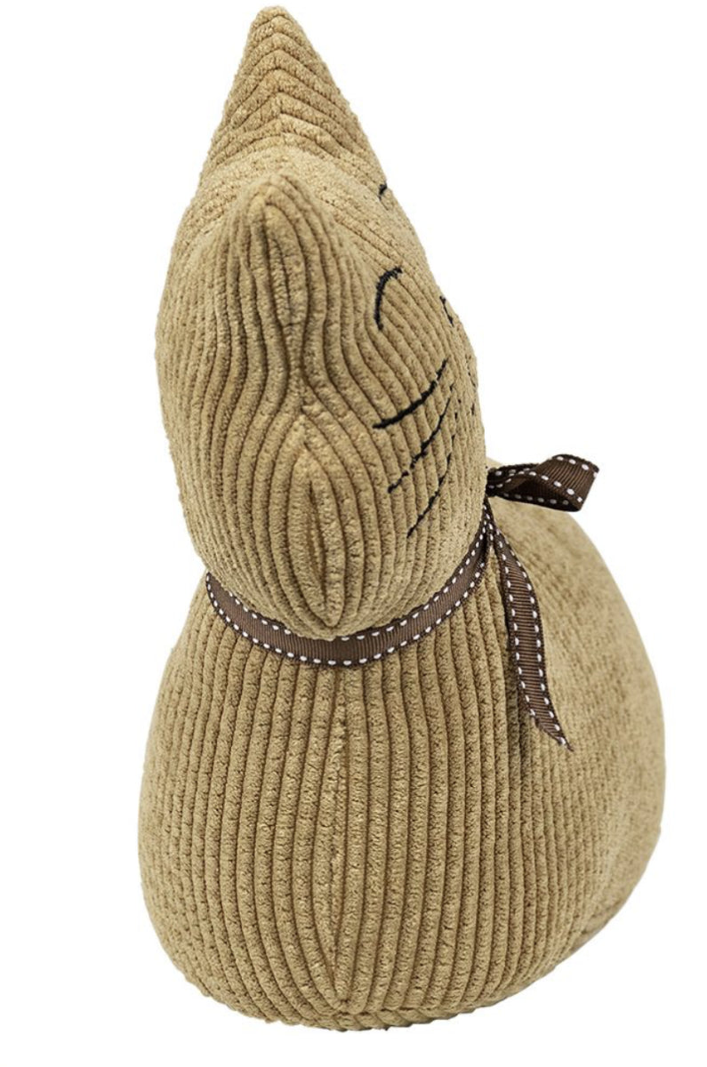 Een deurstopper in kattendesign, okergeel in materiaal polyester afgewerkt met een strikje.