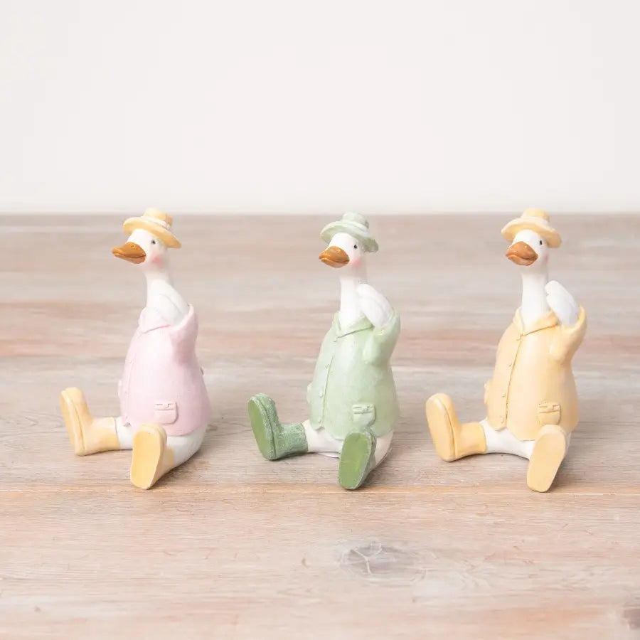 Een uniek eendenornament met groene laarzen, jas en hoed. Prachtig vormgegeven in een charmante zittende houding.