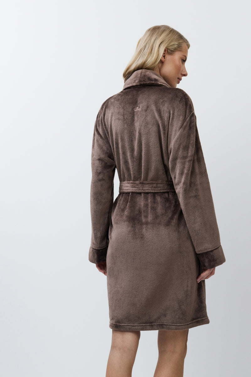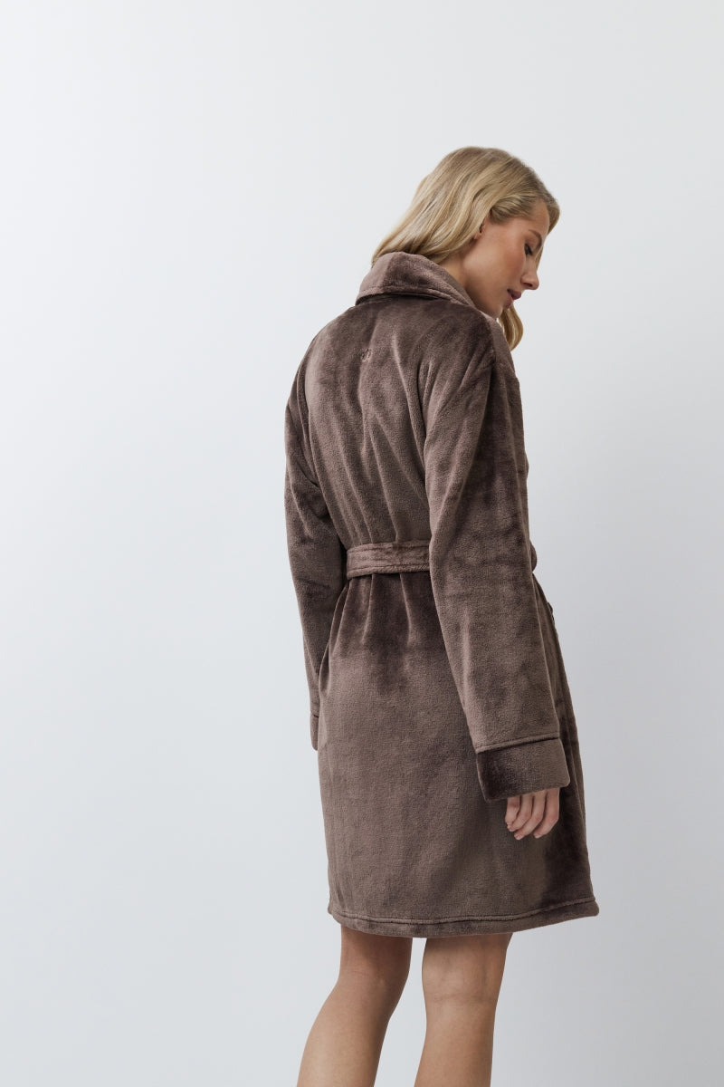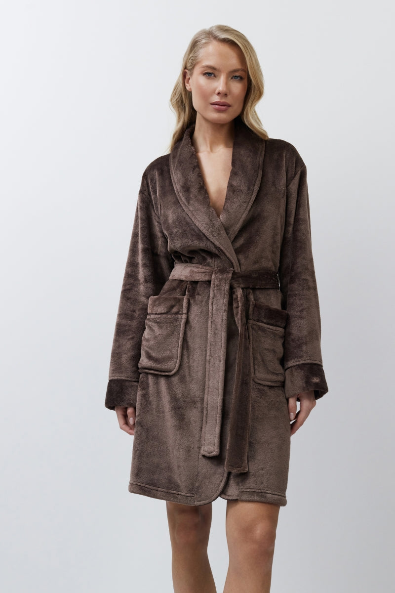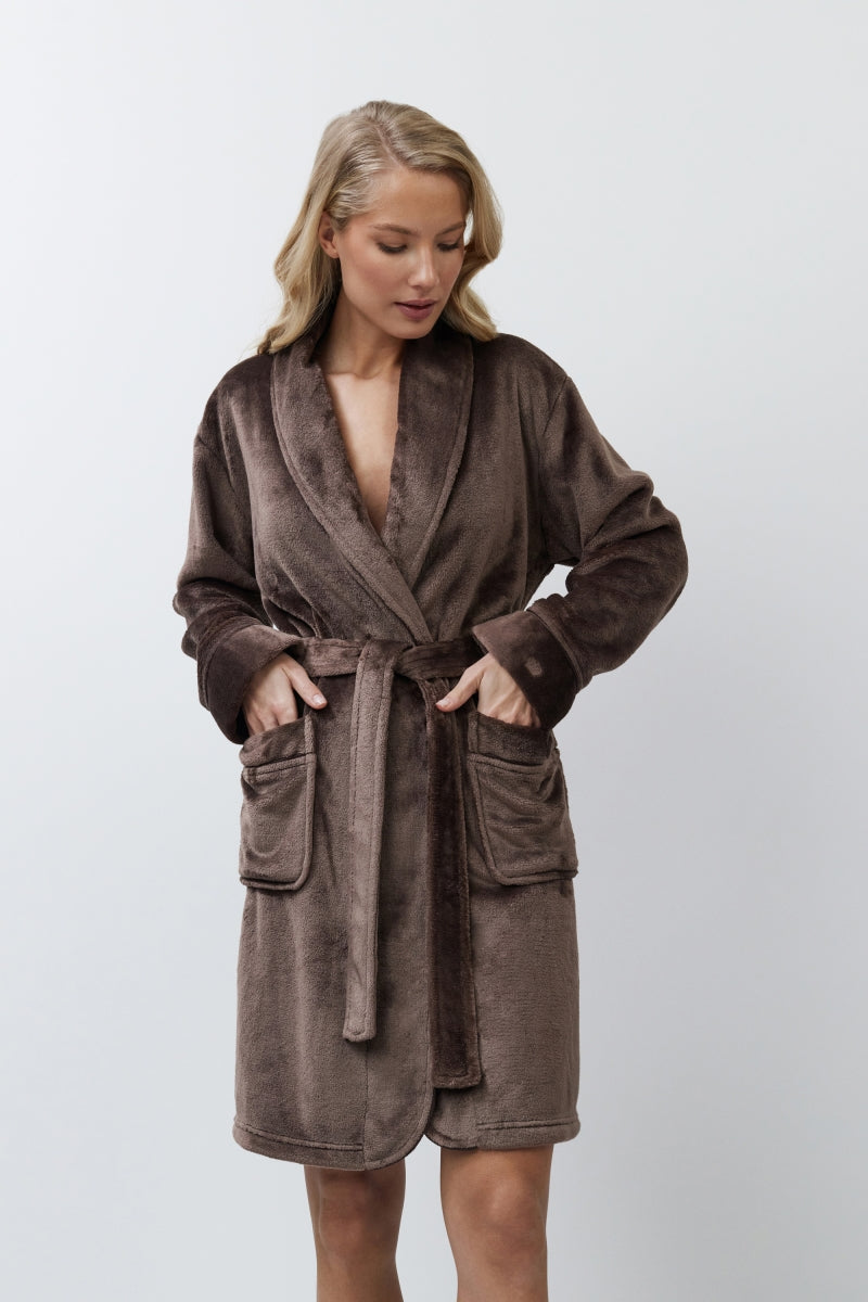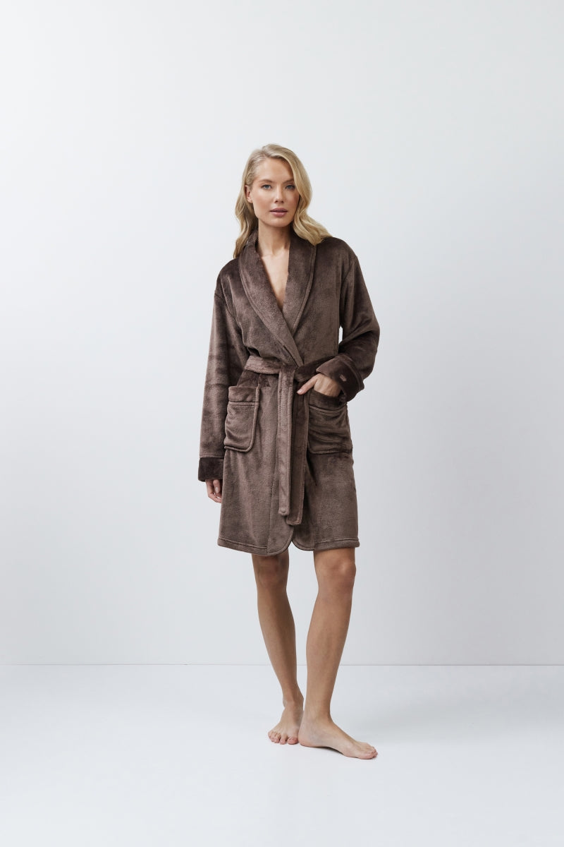 Elegante korte damesbadjas van hoogwaardige materiaal.