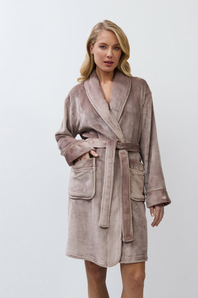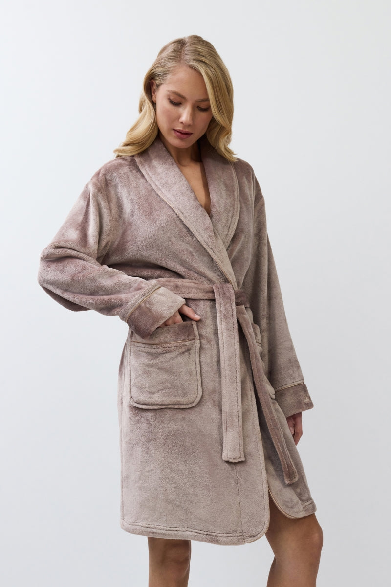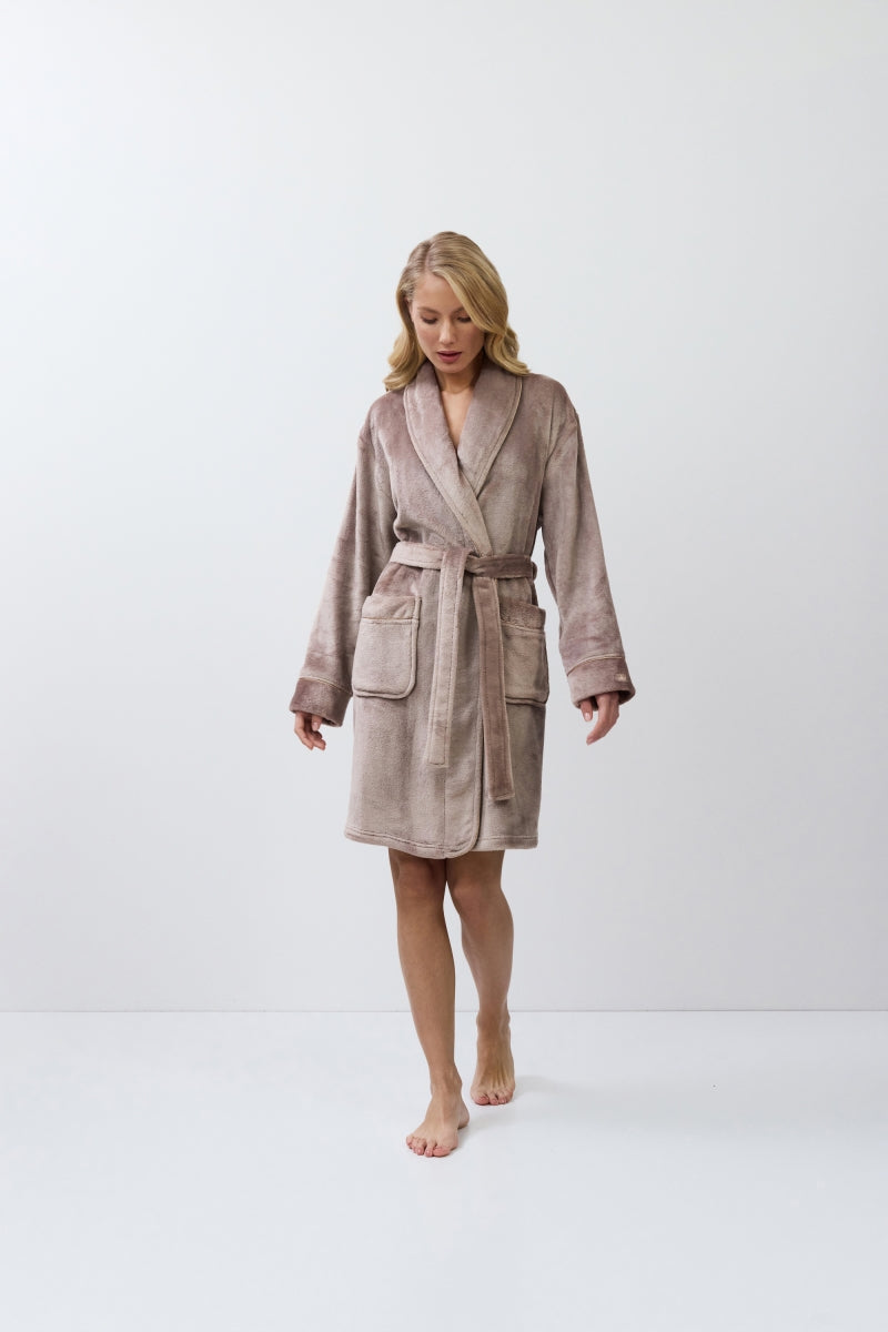 Elegante korte damesbadjas van hoogwaardige materiaal.