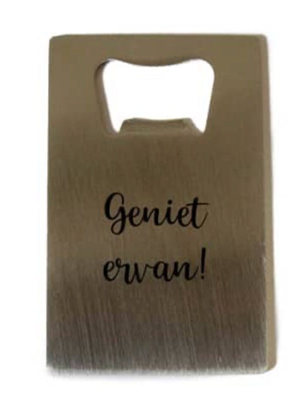 Flesopener kaart zink ‘Geniet ervan’ of 'Proost' met afmeting8.5×5.5cm