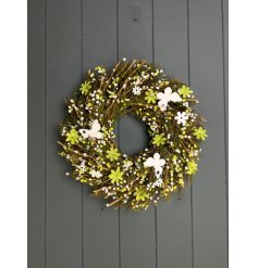 Een rustieke takjeskrans versierd met kunstbloemen en groen, afgewerkt met 3 lasergesneden vlinders.