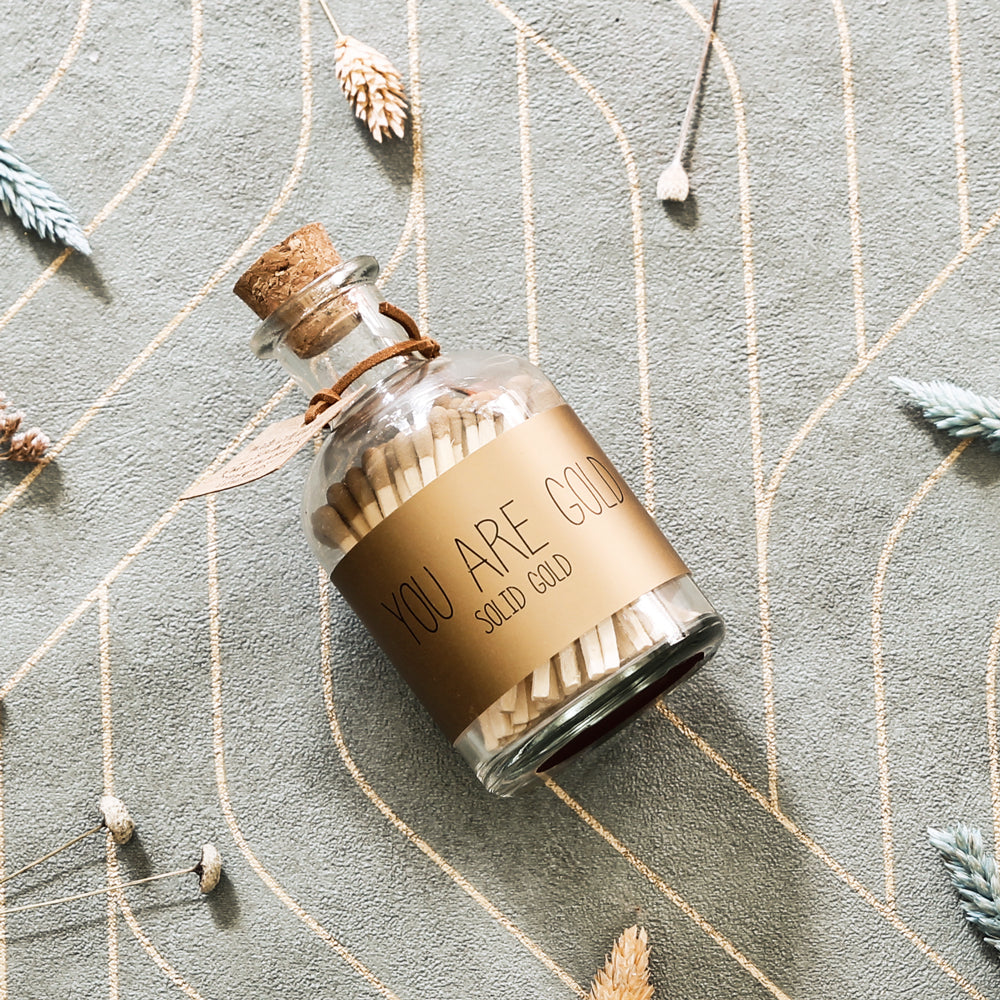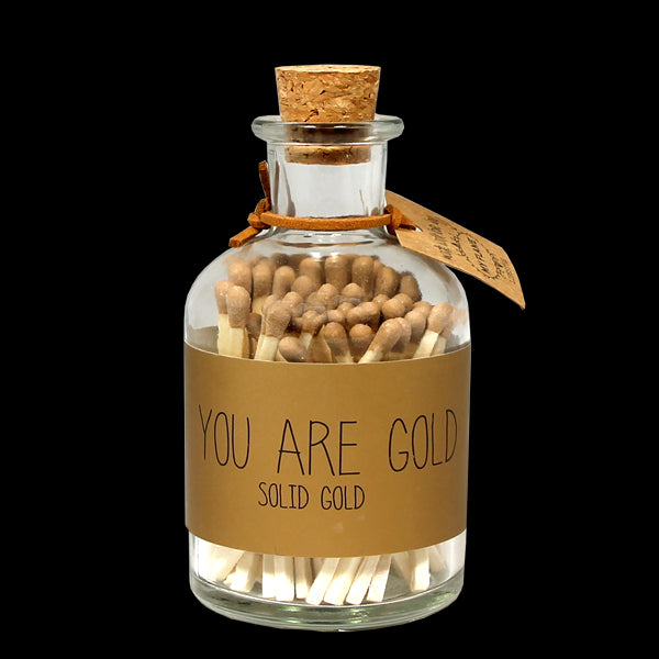 Een glazen potje met 80 goudkleurige lucifers. Met deze lucifers ben je helemaal in stijl met een matchende kaars. Het potje wordt gesierd met de tekst 'YOU ARE GOLD'.