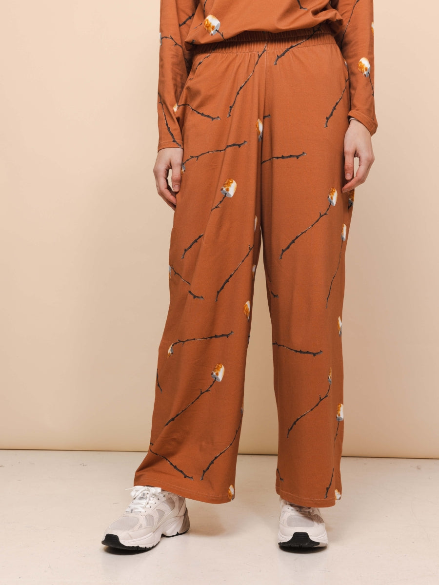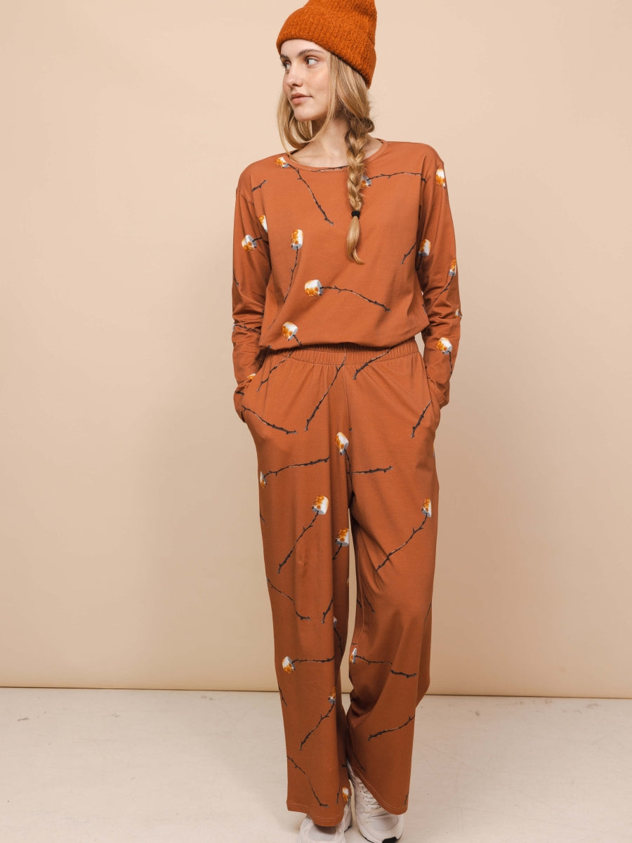 Dames shirt lange mouw en broek met wijde pijpen met fotoprint gemaakt van 95% biologisch katoen, 5% elastaan.