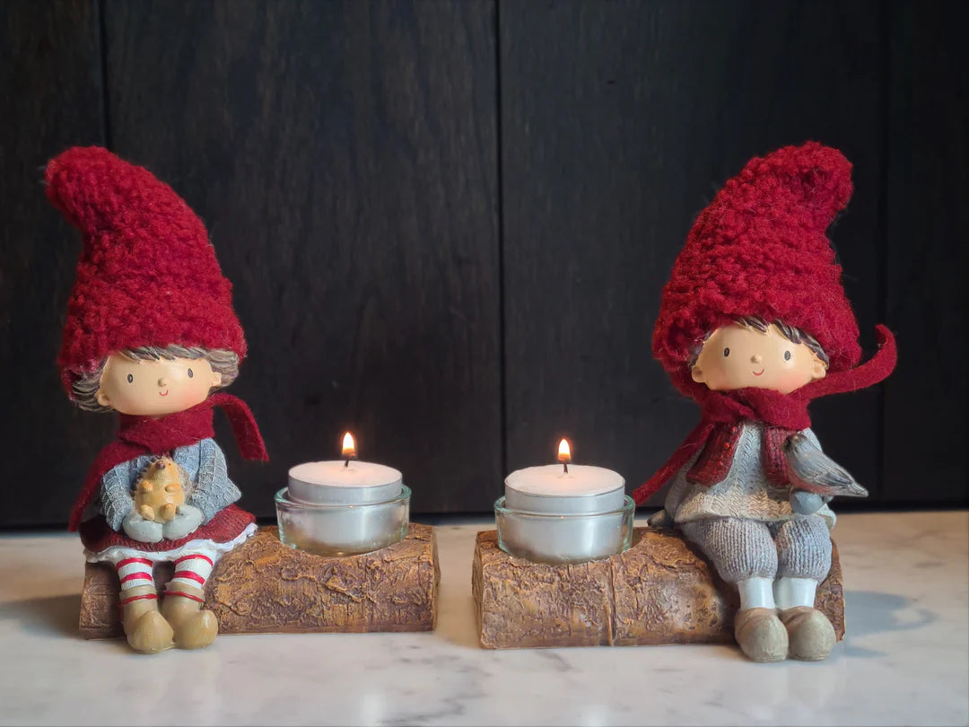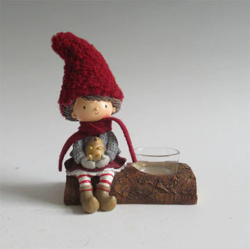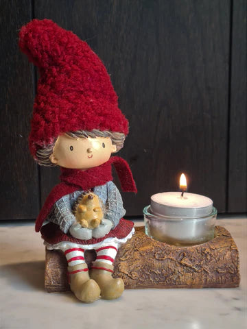 Meisje op boomstronk rode outfit t-licht 15 cm