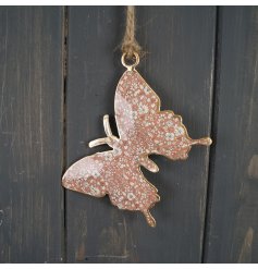 Een lieve, kleine hangende vlinderdecoratie met een roze bloemenembleem in het midden