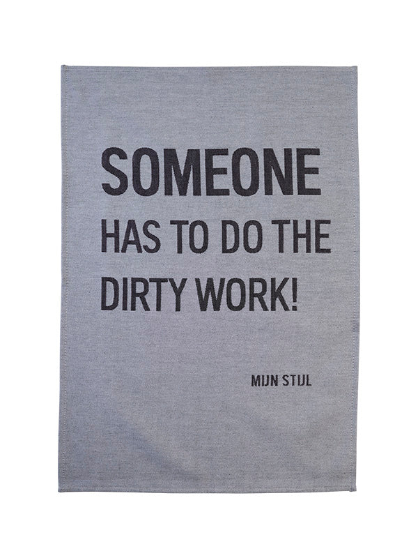 MIJN STIJL-THEEDOEK GRIJS MET ZWARTE LETTERS : SOMEONE HAS TO DO THE DIRTY WORK