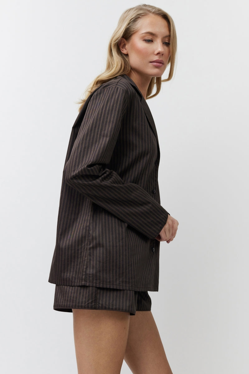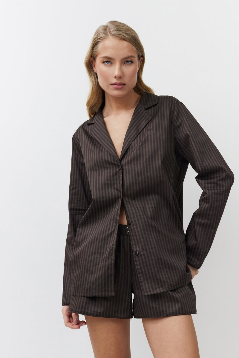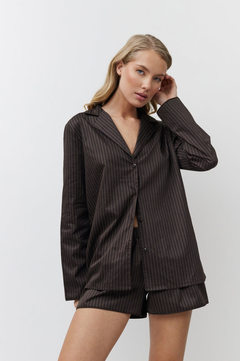 Geniet van maximaal comfort met onze stijlvolle pyjama van Aruelle. Dit prachtige donkerbruine streepmotief ensemble heeft een blouse met lange mouwen & knopen ,V-hals en korte broek met tailleband afgewerkt met 2 knoopjes.