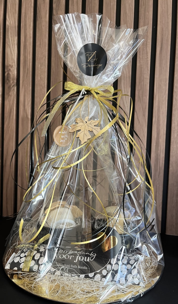 serveerschoteltjes (2x) zwart met hout - mini sojakaarsje You rock! - houten paddestoel H 7cm - gondeldoosje een bedankje voor jou (bath bombs)