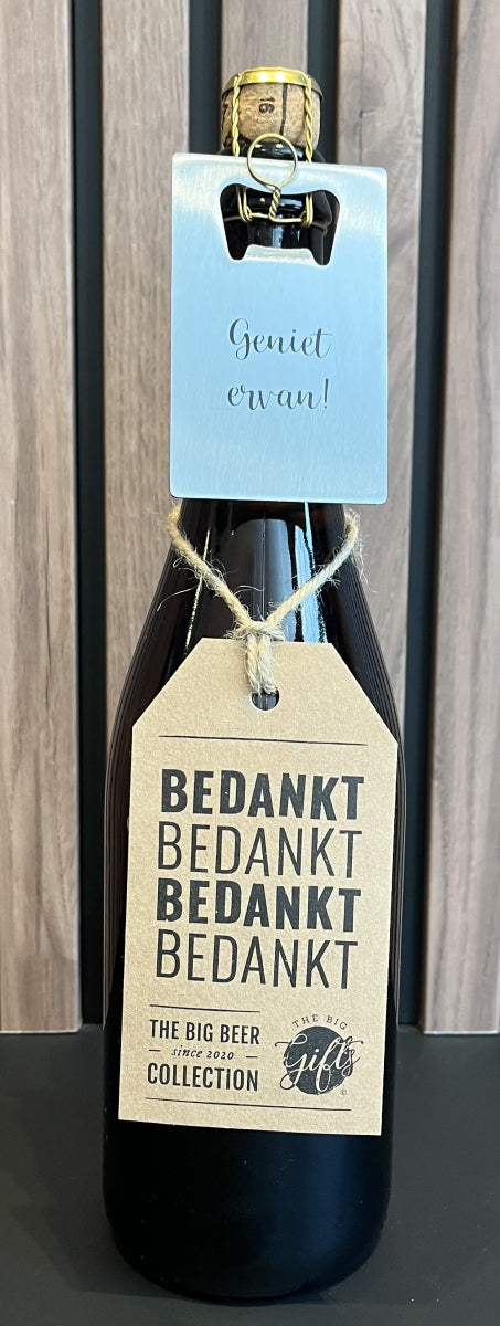 bestaande uit Bierfles XL Bedankt & een flesopener zink opschrift 'Geniet ervan!'