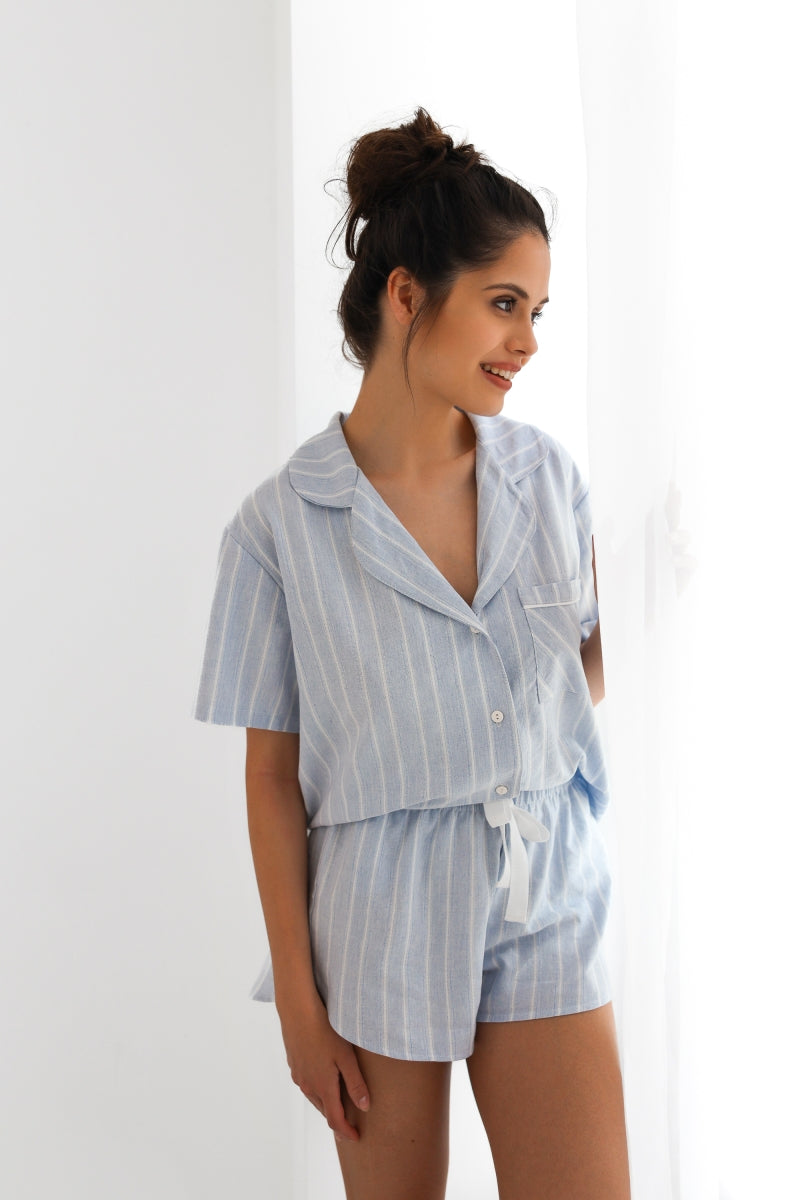 Elegante dames pyjama met korte broek uit zachte viscose, vestje met knopen en borstzakje, korte broek met strik.
