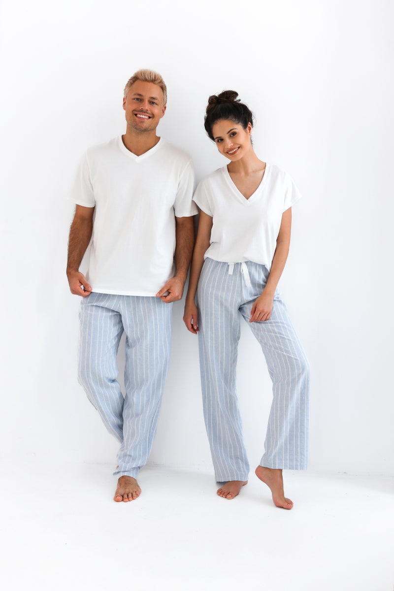 Elegante dames pyjama met lange broek met strik uit zachte viscose, witte T-Shirt katoen met V-hals.