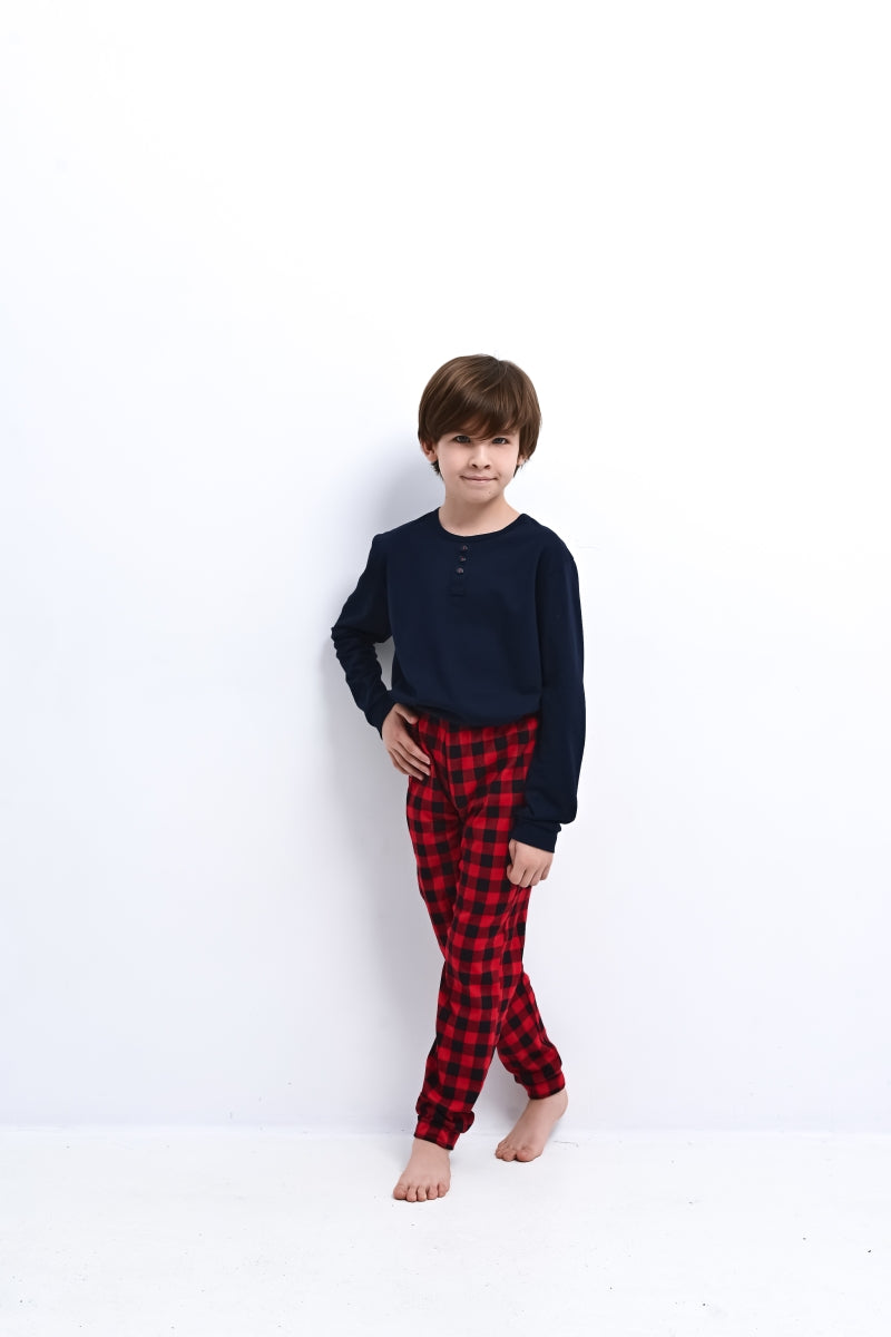 Kleur: effen donkerblauwe shirt met lange mouw, geruite rode/donkerblauwe broek