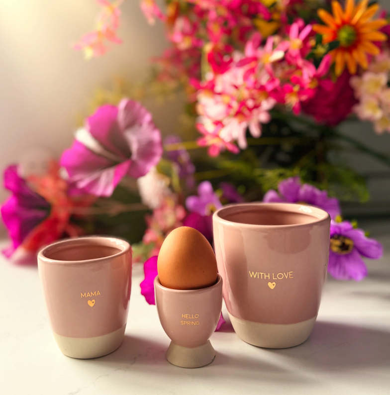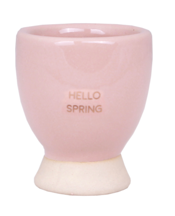 De stijlvolle roze keramieken eierdopje met gouden quote Hello Springis na het branden te gebruiken als eierdopje – een duurzaam detail dat elke ontbijttafel laat stralen.